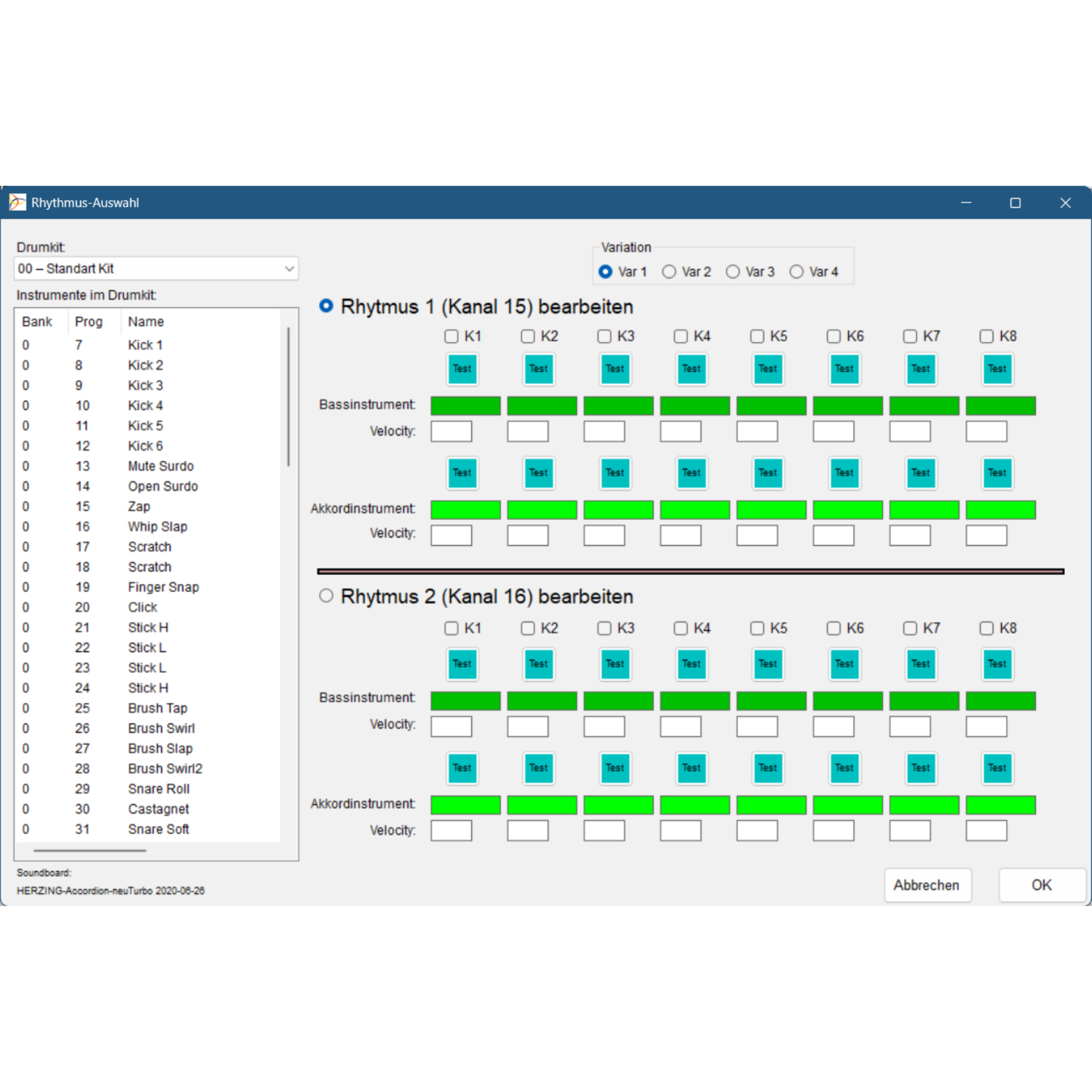 – Komfortable Rhythmus – Programmierung, erscheint wenn in der Kanalzuordnung bei K15 oder K16 „Rhythmus“ eingetragen wird bei Doppeldruck auf das Feld „Instrumente“.
