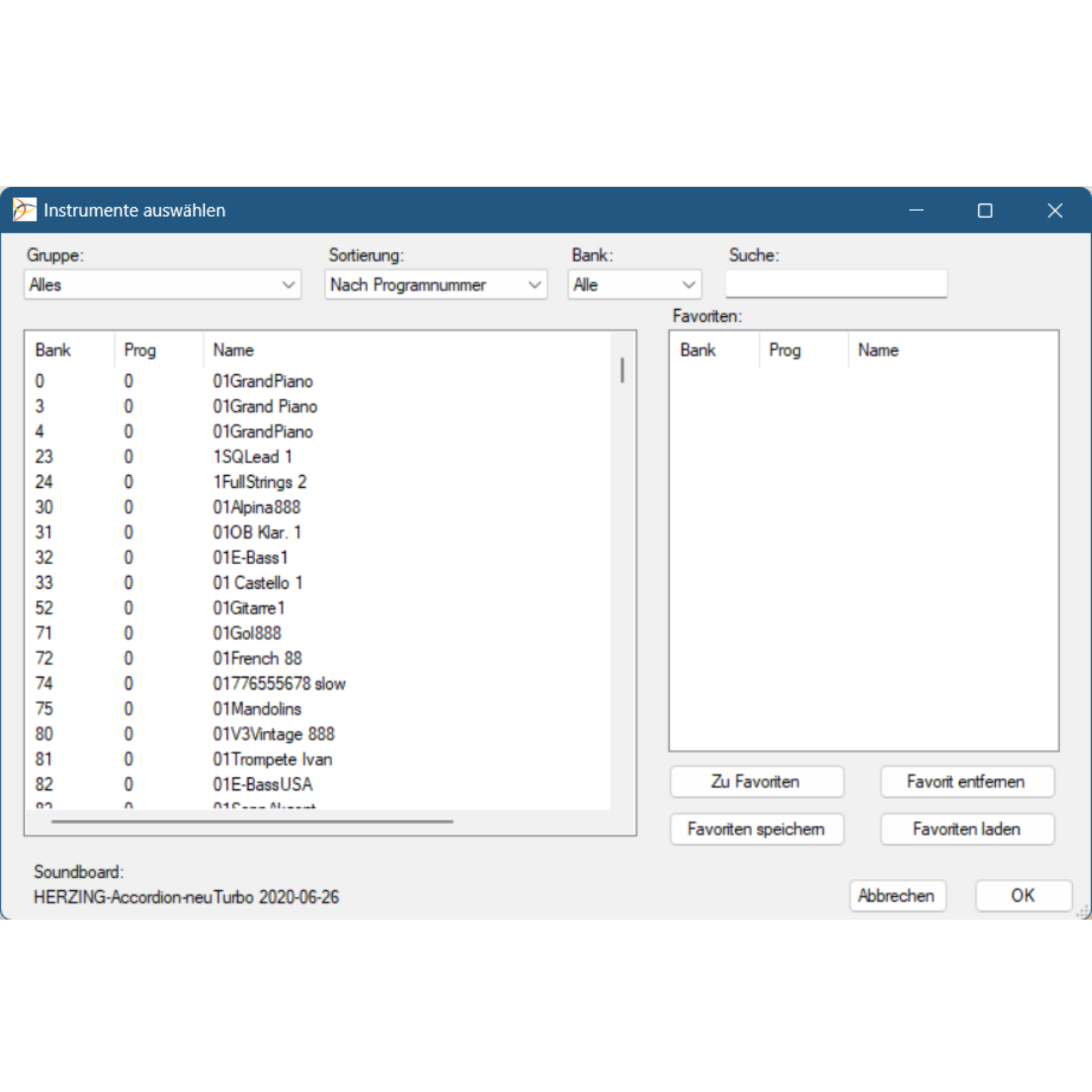 – Festlegung und Speicherung von Favoriten bei der Instrumentenauswahl